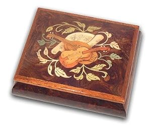 Product Description : Very attractive natural dark wooden finish accompanies this gorgeous hand inlaid Reuge Music Violin and Mandolin theme "musical jewelry box". The music box is beautiful in many ways, it has a nice in lined dark brown velvet ring / earring compartment for a few of your personals and an outstanding overall rosewood finish. Plays the perfect 18 Note Swiss musical movement and will make any room more peaceful and joyful.Choose a tune from a large list below that strikes you most from the pull down menu. This item is priced like never before and is guaranteed to be the best gift you can find with many smiles and memories to come! Thank you for your interest and don't look further cause this is the one you have been looking for! Great quality, prestige and the lowest guaranteed price! Your satisfaction is always guaranteed at The Attic, let us know what we can do for you..... Dimensions: Lenght - 4.5"Width - 3.75"Height - 2.5"